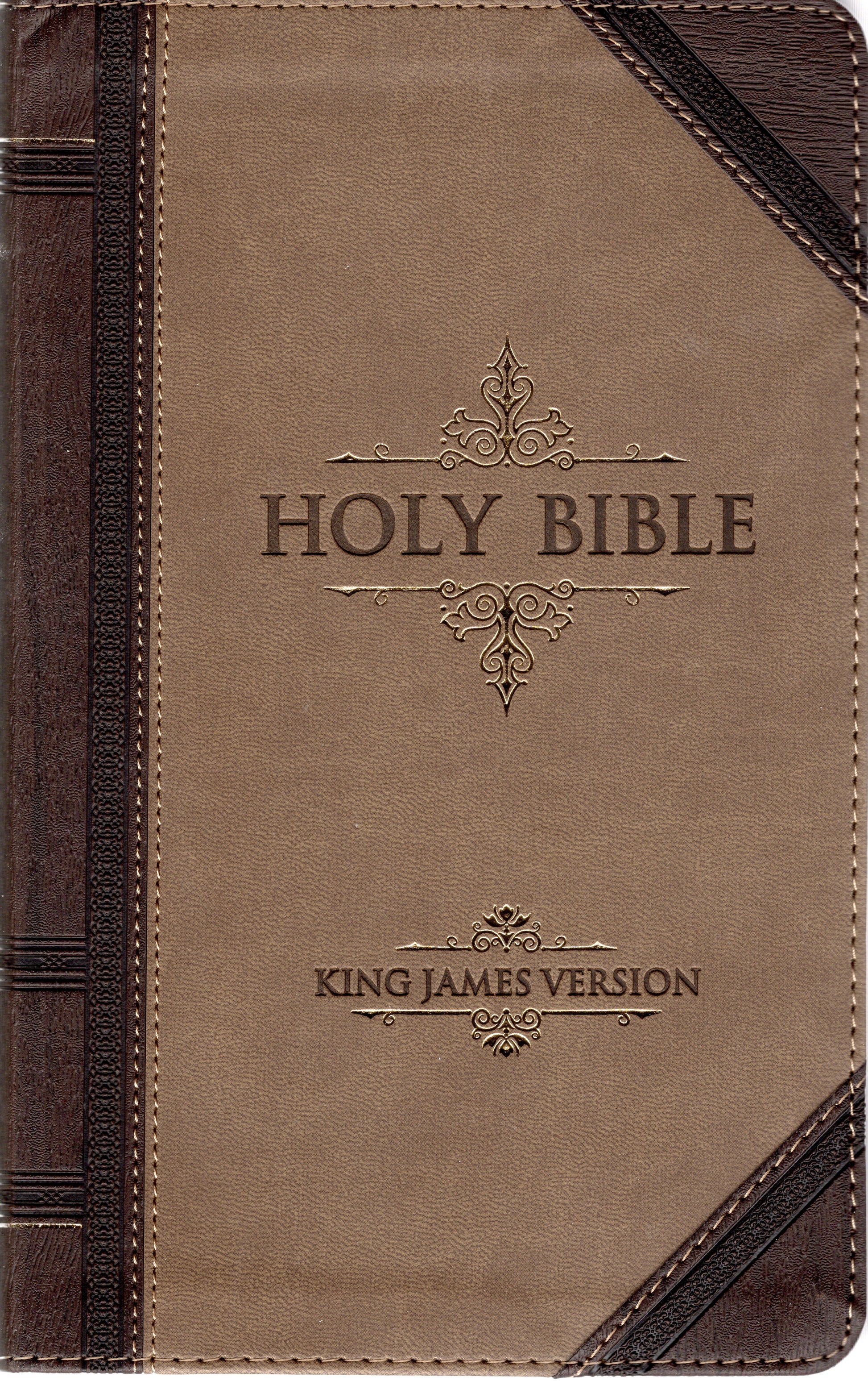 This traditionally styled, two-tone Faux Leather Bound Giant Print Standard Size Edition offers the classic King James Version in an easy to read 14 point giant print. The cover is constructed of quality man-made material with the look and feel of real leather (trade name LuxLeather). Design features include a two-tone look in dark brown and tan with contrast top-stitching, a debossed title, gold-foiled filigree design, gold gilt-edged pages and an attached ribbon page marker. Inside, you'll find reader-friendly subheadings, a double-column format, words of Christ printed in red ink, a helpful Scripture verse finder by topic and a one-year Bible reading plan.